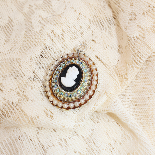 Vintage 1950's Cameo Gold Tone & Iridescent Rhinestones Faux Pearls Pendant